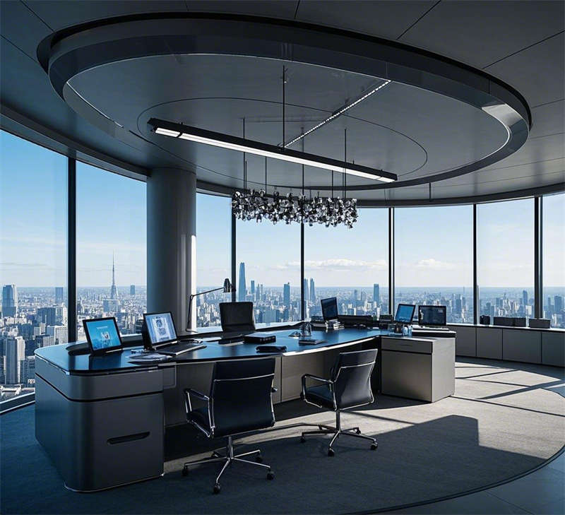 前臺接待室以懸浮式前臺和全息投影動態(tài)logo為核心,金屬質(zhì)感墻面與燈光效果結(jié)合,營造出未來之門的第一印象。敞開式辦公室通過數(shù)據(jù)流全息屏幕和智能辦公桌,打造高效協(xié)作的數(shù)字化辦公環(huán)境。經(jīng)理辦公室采用全景落地窗和智能辦公系統(tǒng),簡約大氣,兼顧商務(wù)與舒適。總裁辦公室位于頂層,全景視野與奢華材質(zhì)相得益彰,藝術(shù)裝置彰顯領(lǐng)導(dǎo)風(fēng)范。