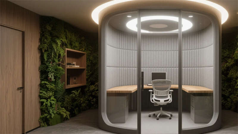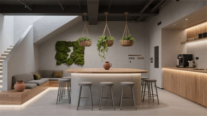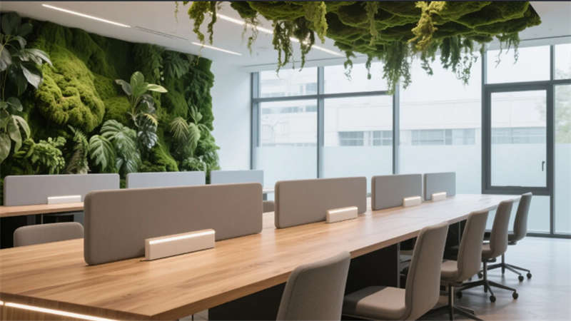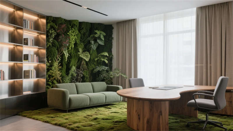 該設計以“自然共生”為脈絡,將綠植生態系統與現代辦公需求深度融合。入口處以苔蘚藝術臺與流水光墻奠定基調,流動的綠意從呼吸幕墻延伸至開放辦公區,原木桌面在漫射天光中模糊室內外界限。獨立辦公室的垂直森林墻與靜音艙的苔蘚隔斷,在私密空間延續生態語言。