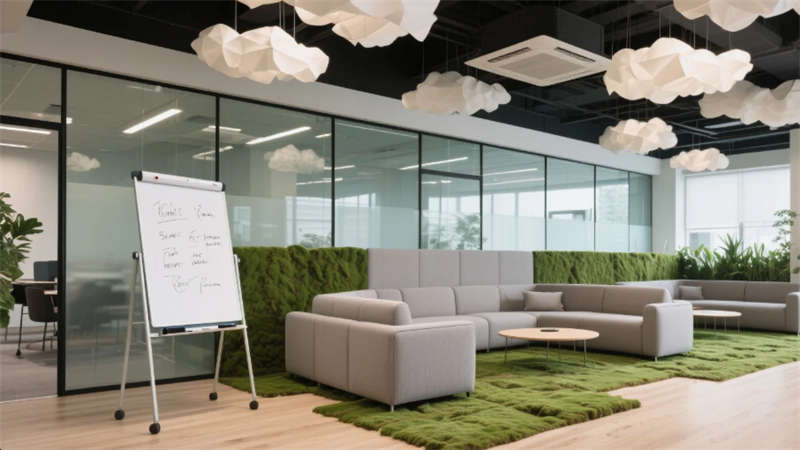 協作區域呈現有機張力:茶水間的階梯式布局激發非正式交流,可書寫玻璃環繞的頭腦風暴區釋放創造力,而模塊化沙發的灰綠色調呼應窗外城市綠景。多功能廳的折疊原木階梯與生態屏幕,在科技與自然間取得平衡。