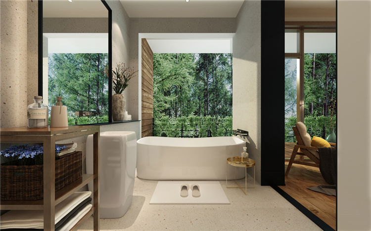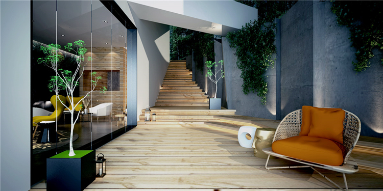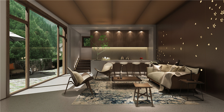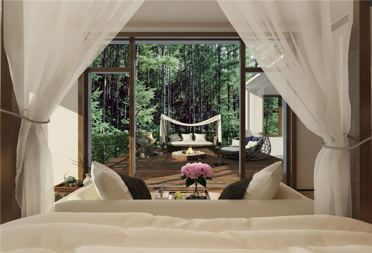 本案度假酒店設計的重點在于表達人與自然、現代裝飾與自然環境的融合。每一組家具的設計、每一個走廊通道的位置,在這里都能感受到時尚與自然,毫不違和。