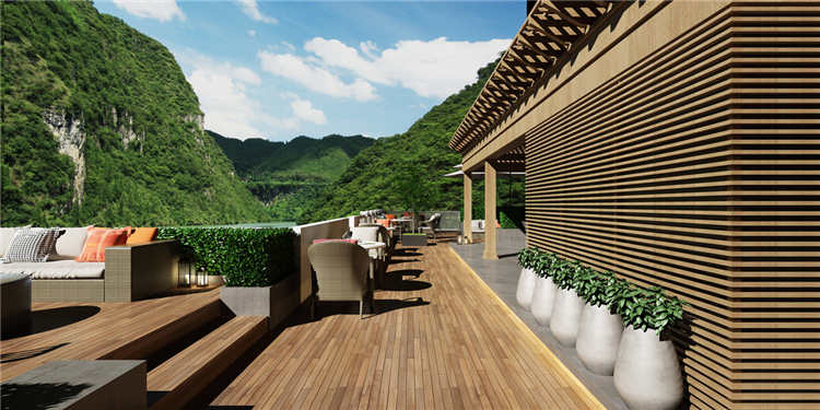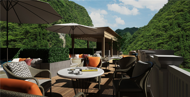 本案度假酒店設計依山傍水,設計師在規劃時,充分考慮到自然環境帶給酒店的附加值。設計方案時,設計師就將部分功能區規劃到室外露天場地,當然在室內設計中也充分利用了自然采光的設計手法,讓整個度假酒店與自然環境融為一體。