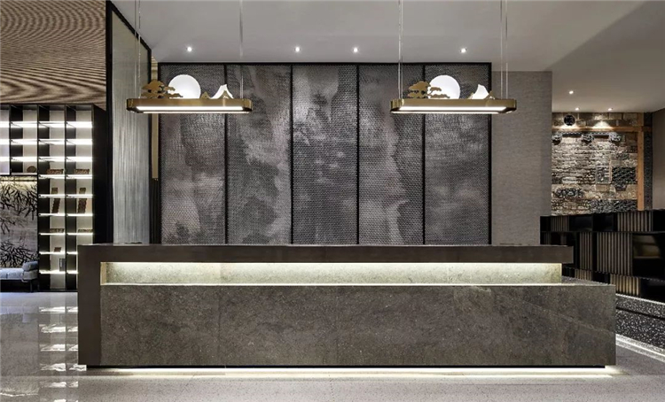 傳統(tǒng)與現(xiàn)代的融合變通,通過(guò)汲取傳統(tǒng)徽派的木構(gòu)斗拱、瓦片、留白的山墻和民居的水墨意境,運(yùn)用新的材料進(jìn)行演繹,如水磨石的地面、背景墻藝術(shù)圖案結(jié)合金屬網(wǎng)、半透的夾絲玻璃、黑色的金屬構(gòu)建.以寫(xiě)意的方式提取徽州的意境,延續(xù)徽派建筑的黑白兩色,再點(diǎn)以中國(guó)傳統(tǒng)色系軟裝搭配,表達(dá)了設(shè)計(jì)對(duì)傳統(tǒng)的回歸和未來(lái)的展望.