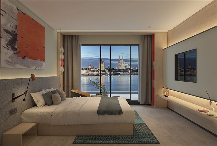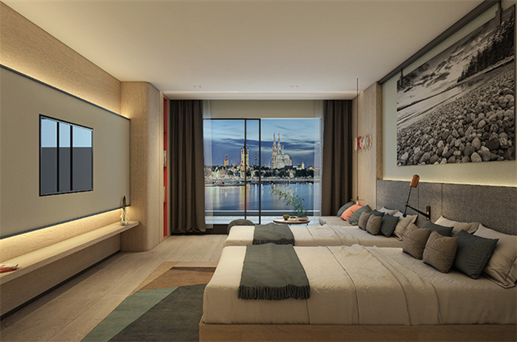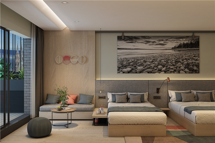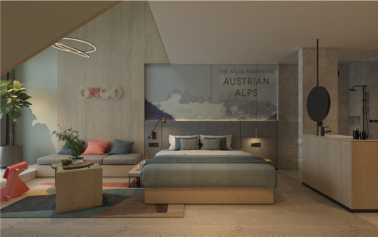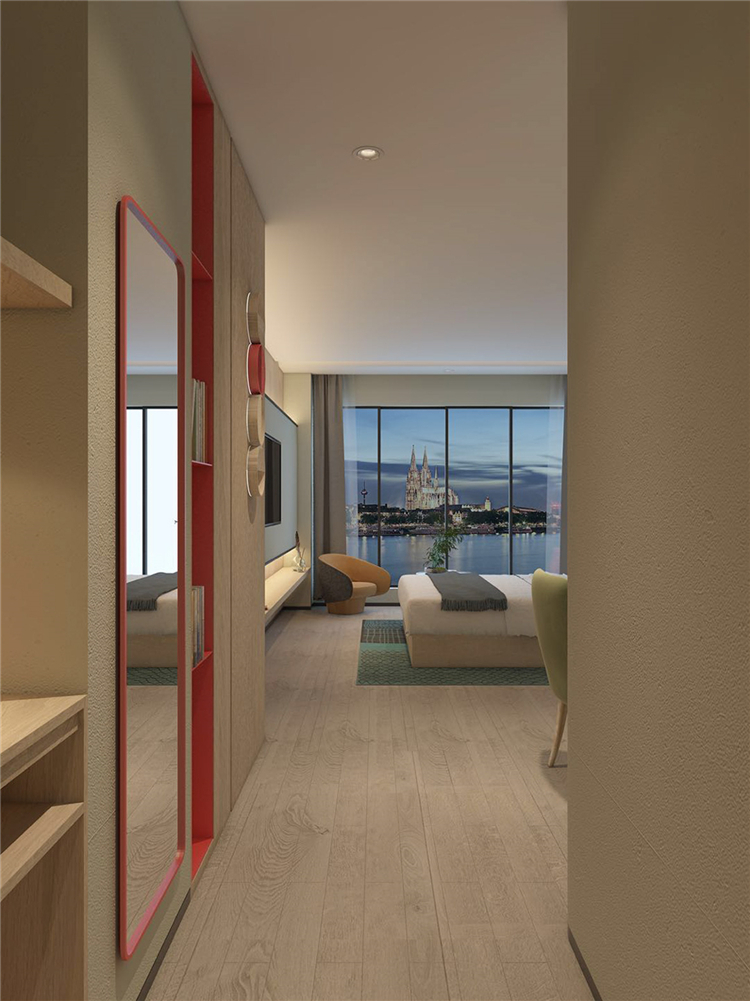 在功能的安排上人性化,為顧客帶來舒適的入住體驗與外立面相呼應(yīng),設(shè)計師在完整的用材體系上,增加了對比性明顯的色塊,高度提升了空間的趣味性和耐看度。