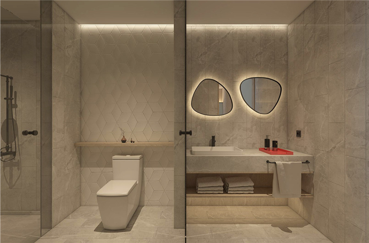 設(shè)計師遵循原有的管道設(shè)計,通過半堵實用的功能墻,將洗浴間和馬桶間劃分,在隱形了五金件和儲物歸納后,化繁為簡被得到了充分的運用,就連回風(fēng)口也被巧妙的融入在燈帶里.