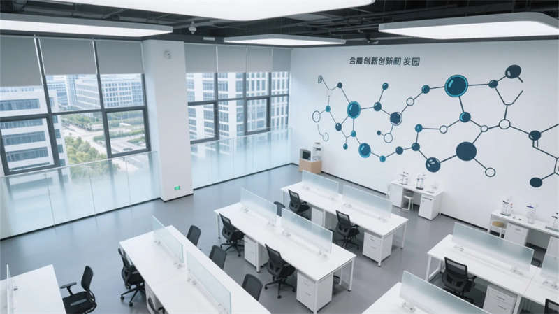 物流中庭的挑空設計打破廠房尺度壓迫感,懸掛式數(shù)據(jù)看板如抽象藝術(shù)品,與玻璃穹頂投下的天光共構(gòu)科技禪意。研發(fā)區(qū)可移動實驗裝置墻體現(xiàn)柔性生產(chǎn)理念,分子結(jié)構(gòu)藝術(shù)墻繪暗喻制造背后的科學探索。
