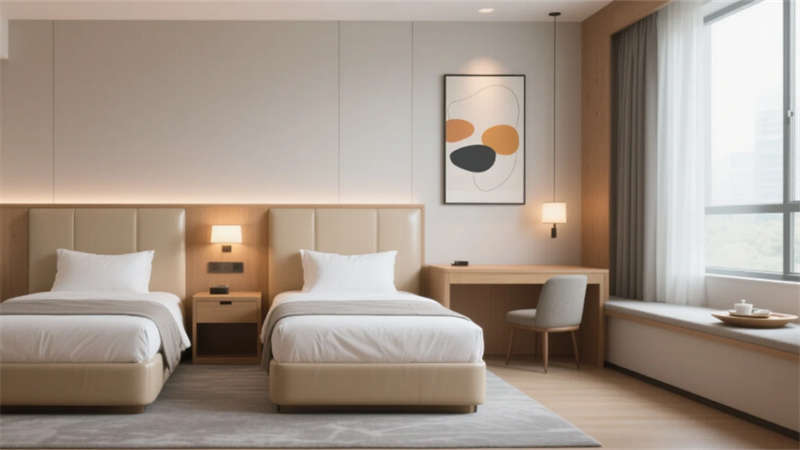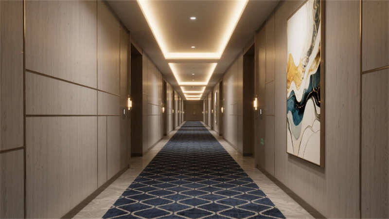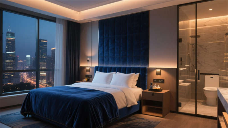客房設計聚焦人性化體驗:大床房以深藍色絲絨床頭與城市夜景形成戲劇性對比,透明玻璃隔斷的圓形浴缸賦予空間通透感;雙床房通過原木色書桌、飄窗茶臺與抽象掛畫,平衡商務與居家需求。走廊則運用深藍色幾何地毯與隱藏式燈帶,引導視線至盡頭的藝術畫作,靜謐中暗藏張力。