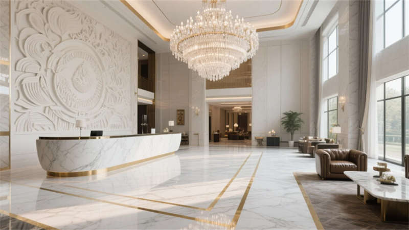 步入挑高8米的大堂,巨型水晶吊燈如銀河傾瀉,與白色大理石地面的金色脈絡相呼應;立體浮雕藝術墻融合傳統雕刻與現代光影,搭配皮質沙發與綠植造景,營造出兼具儀式感與松弛度的迎賓空間。