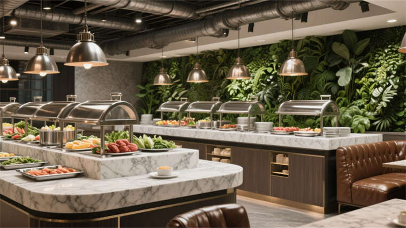 餐廳以工業風吊燈與綠植墻碰撞出活力氛圍,開放式取餐臺與大理石餐桌彰顯品質;行政套房客廳通過L型布藝沙發、木格柵電視墻與山景落地窗,打造出私享化的社交場景。