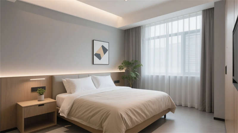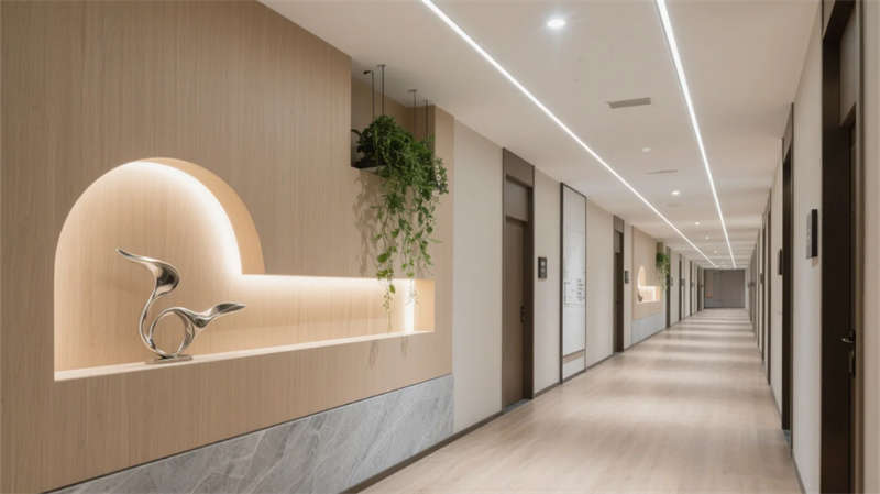 酒店以現代簡約美學貫穿始終,走廊作為串聯各區域的紐帶,延續了整體的設計語言。弧形壁龕與懸浮天花板的線性燈光,柔和地引導動線,淺木飾面與石材的碰撞在低調中彰顯質感。壁龕內的藝術擺件與垂墜綠植,將自然氣息融入過渡空間,打破傳統走廊的單調感。