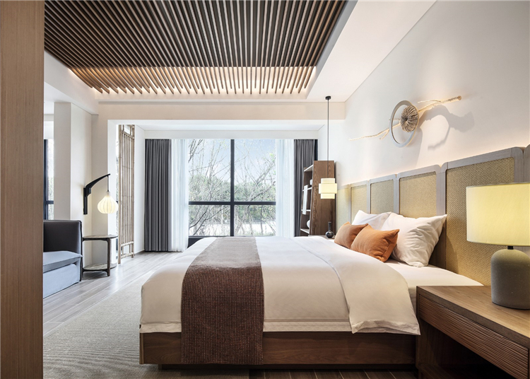 客房布草裝飾選用棉麻材質(zhì),色彩過(guò)渡柔和,給人暖意。床頭的實(shí)木雕畫(huà)回歸原野古樸,竹編吊燈造型各異,一花一草一木皆入景,簡(jiǎn)而裁,巧而自然。竹藏風(fēng)雨,觸及野趣,山居生活隱逸悠然,靜念生長(zhǎng)。