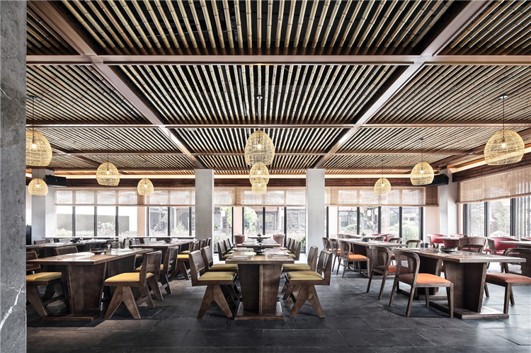 入口處,取自田間的南瓜瓜藤被巧妙用作空間中的藝術(shù)裝置,演繹田園之樂(lè)。整個(gè)空間輔以大量的竹木,意蘊(yùn)古樸,光影變化中,增添了清新和雅氣息。