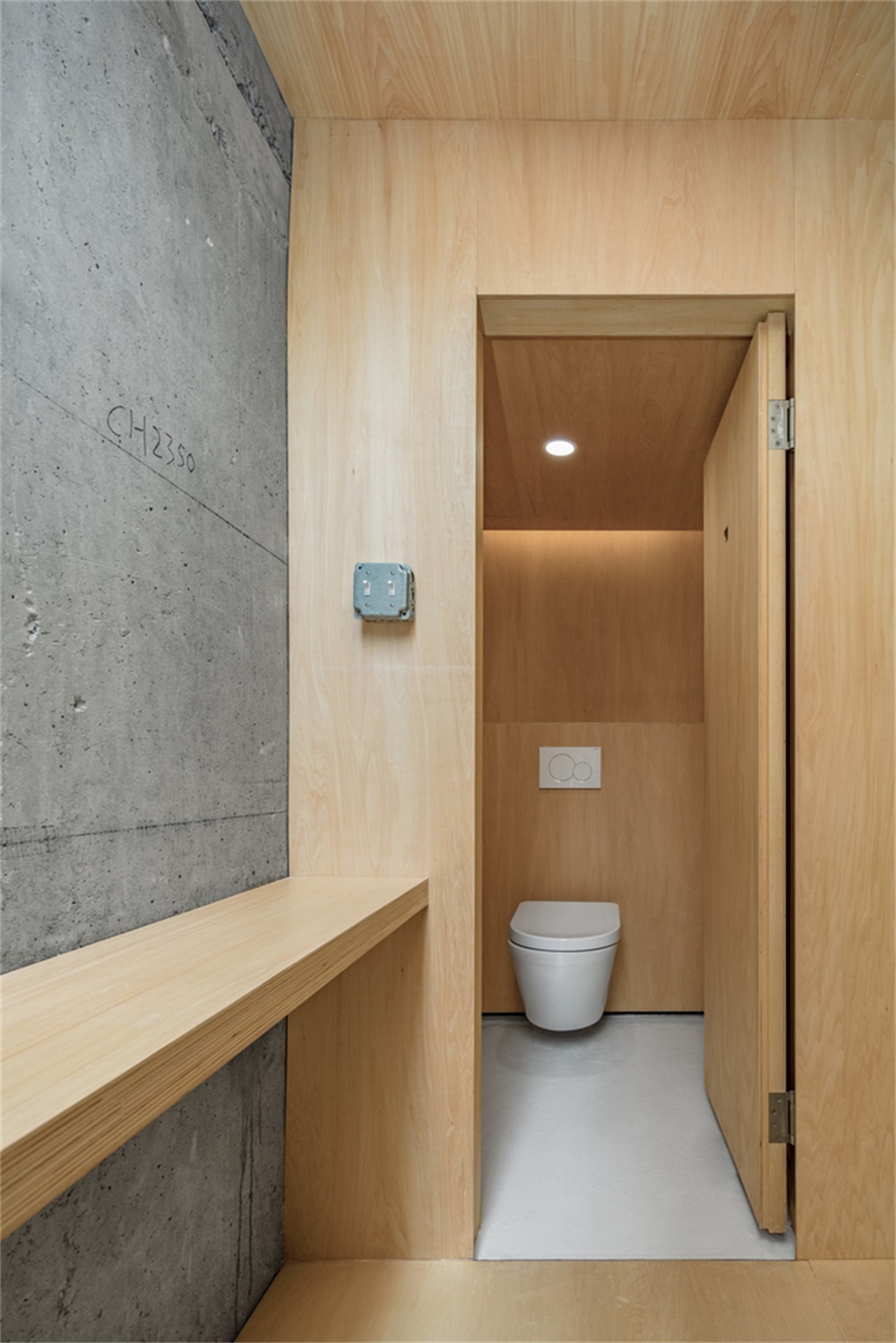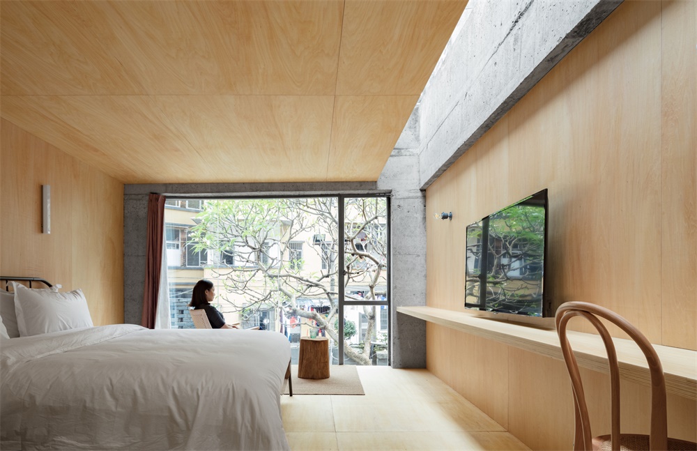 建筑四周圍繞著老式居民樓,為了使其呼應(yīng)周圍居住環(huán)境的氛圍,特意保留了原有立面具有歷史質(zhì)感的青磚。此外,在外立面的門窗的位置和進(jìn)深的設(shè)計(jì)上,結(jié)合整個(gè)建筑比例和室內(nèi)布局以數(shù)十厘米為單位進(jìn)行了微調(diào),使得室內(nèi)視野開敞且采光充足。金屬窗框的更換和進(jìn)深的加深則為民宿增添了空間浸入感。