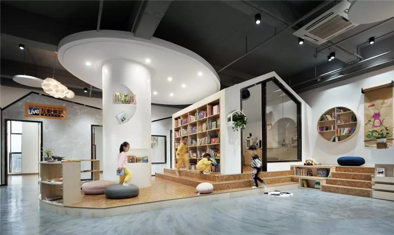 為了保持空間的調(diào)配度,不做過多裝飾;色彩把控上,選擇自然親和的白、灰、木色調(diào),孩子們是唯一的濃墨重彩,繪本則是星星點點的輔助色。用“書吧”的概念打造大廳,弧形書架、圓形吊頂與地面抬升的設(shè)計,讓繪本閱讀成為體量內(nèi)的重心。
