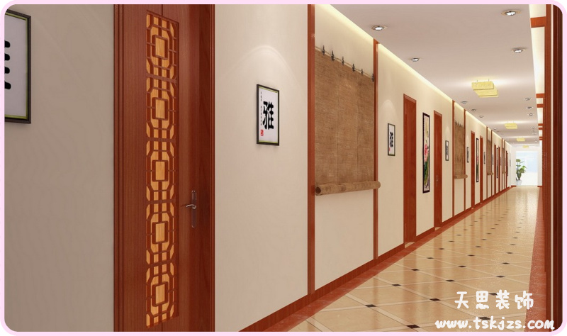 走廊是室內(nèi)流通空間的主要部分,其空間特點(diǎn)是狹長,且缺少變化,人在這種空間中容易產(chǎn)生單調(diào)感。因此,在設(shè)計上應(yīng)做一定的藝術(shù)處理。使其既不能過于華麗、復(fù)雜,也不宜過于簡單、呆板、應(yīng)在墻壁上做一定的裝飾點(diǎn)綴。如做出口線、偏倚柱、外門套和墻壁裝飾線條的藝術(shù)處理,以及字畫或燈光的點(diǎn)綴。在特殊功能區(qū)的路段,可以做色彩變化或不同的裝飾處理,從而形成 統(tǒng)一中有變化的視覺效果。在通常情況下,走廊的設(shè)計要求是:應(yīng)有充足的光照度、統(tǒng)一和諧的界面裝飾,清新淡雅的色調(diào)和明確的導(dǎo)向指示。