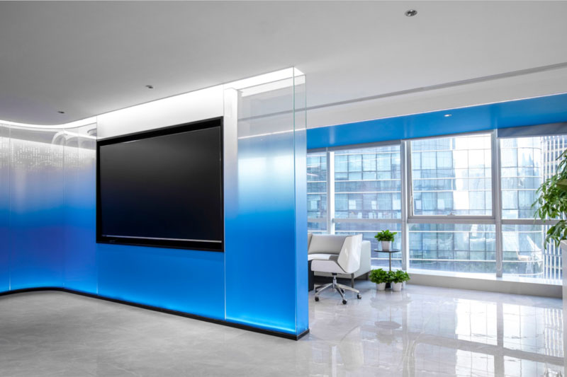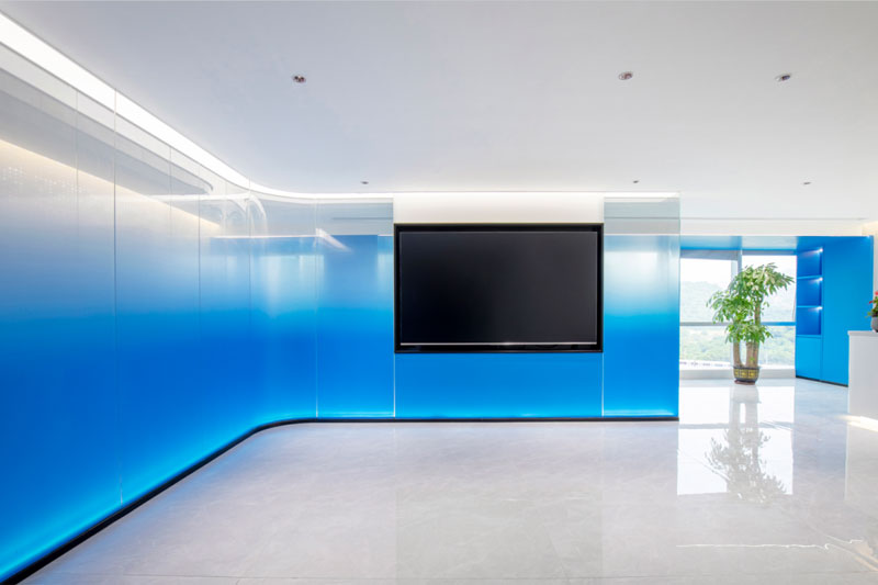 大小會議室都延續了空間的藍色基調,利用通透的藍色玻璃分隔過道,使空間更加通透明亮,不僅讓視感增強,也深刻的加強了品牌形象在訪客心中的作用。