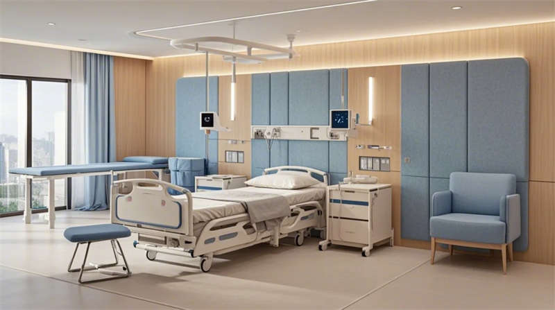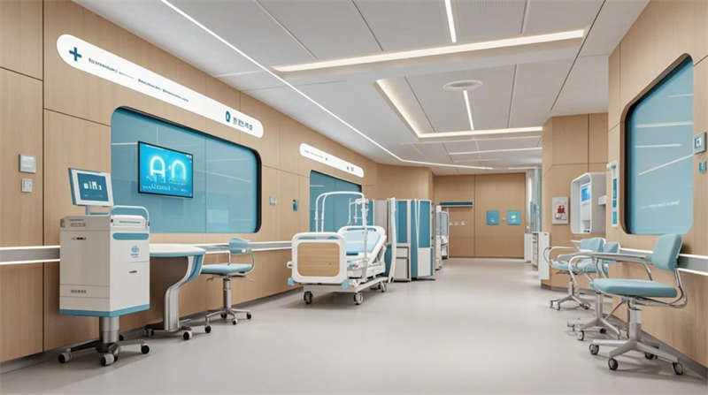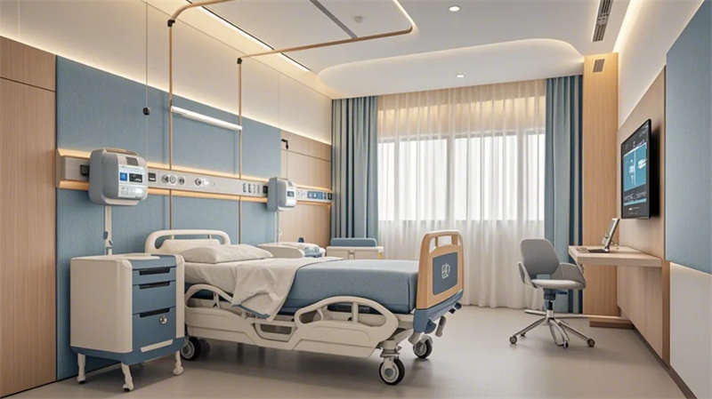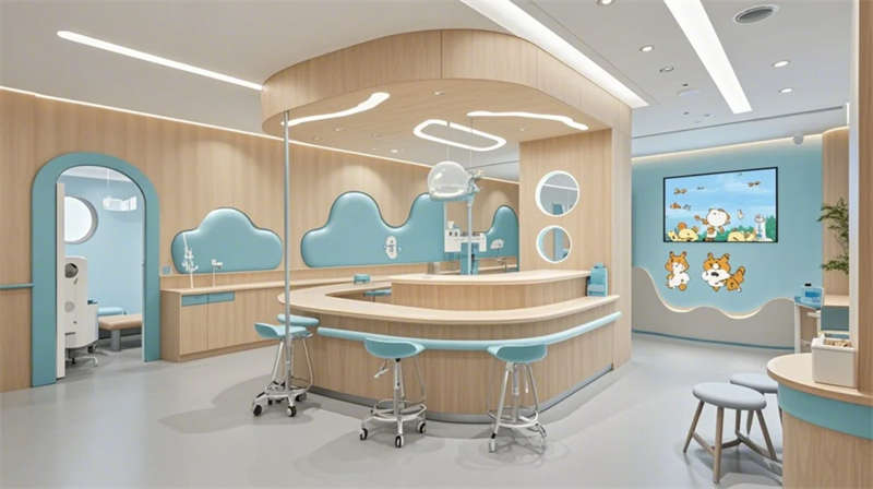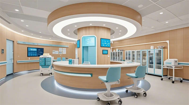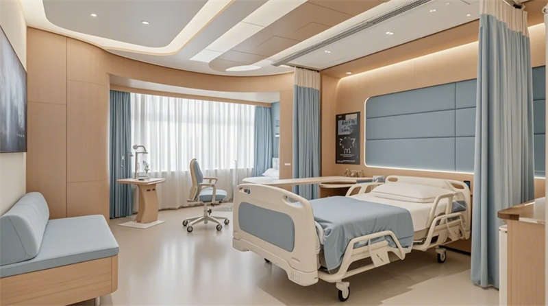 門診大廳以8米挑高空間構建醫療門戶形象,曲面導診臺與智能分診系統形成高效服務樞紐,木紋格柵吊頂與綠植景觀墻弱化傳統醫院的冰冷感。兒科診區創新運用馬卡龍色系與云朵軟包墻面,互動投影游戲區搭配動物主題診療設備,構建兒童友好型醫療環境。VIP病房采用全景落地窗與智能護理系統,可變形家具滿足陪護與康復雙重需求,展現高端醫療的溫度感。