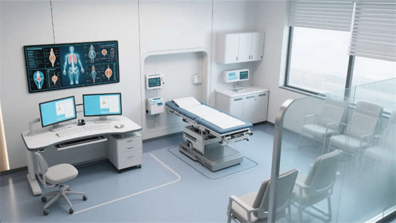 空間以低飽和度灰綠為基調,原生木紋肌理與仿生曲面造型貫穿各區域,形成視覺連續性。主入口大廳通過挑空木格柵天花引入模擬天光,曲面導診臺整合智能導航系統,落地窗外的療愈庭院模糊室內外界限。診室采用霧化玻璃隔斷保障私密性,模塊化醫療設備帶與升降診療桌形成靈活工作界面,電子解剖圖譜墻實現醫患可視化溝通。